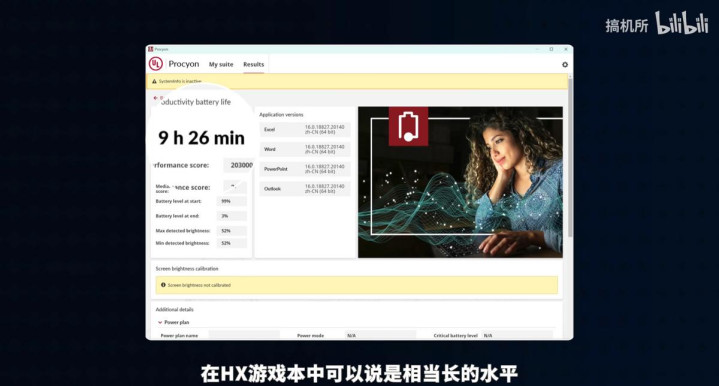屏幕方面,华硕天选6 Pro配备了一块16英寸的IPS电竞屏,拥有2.5K分辨率、165Hz刷新率、400nits的亮度,100% sRGB高色域,支持DC调光以及G-Sync技术,无论是应对竞技类游戏还是内容创作,都有着不俗的表现。此外华硕天选6 Pro还在轻约2.25kg、薄至1.79cm的机身下配备了齐全的接口和90Wh大容量电池,结合英特尔酷睿Ultra 7处理器255HX的高能效,让游戏本也可以做到性能和续航的兼顾,在UP主的实测中也达到了9h26min的亮眼成绩。