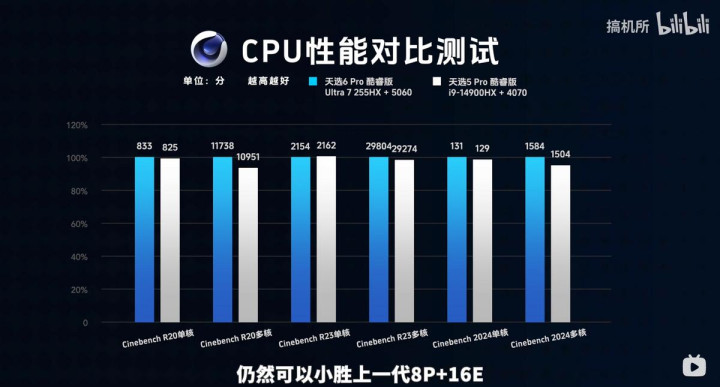 从 UP 主“搞机所”的实测数据来看,英特尔酷睿Ultra 7处理器255HX的单核与多核性能相较上一代均有明显提升,并在多项重负载场景中展现出更优秀的能效表现。这也意味着天选 6 Pro 在面对未来 3A 大作、视频渲染、多软件并行等需求时,可以提供更加稳定且持续的性能支撑,让整体体验更具前瞻性与可靠度。